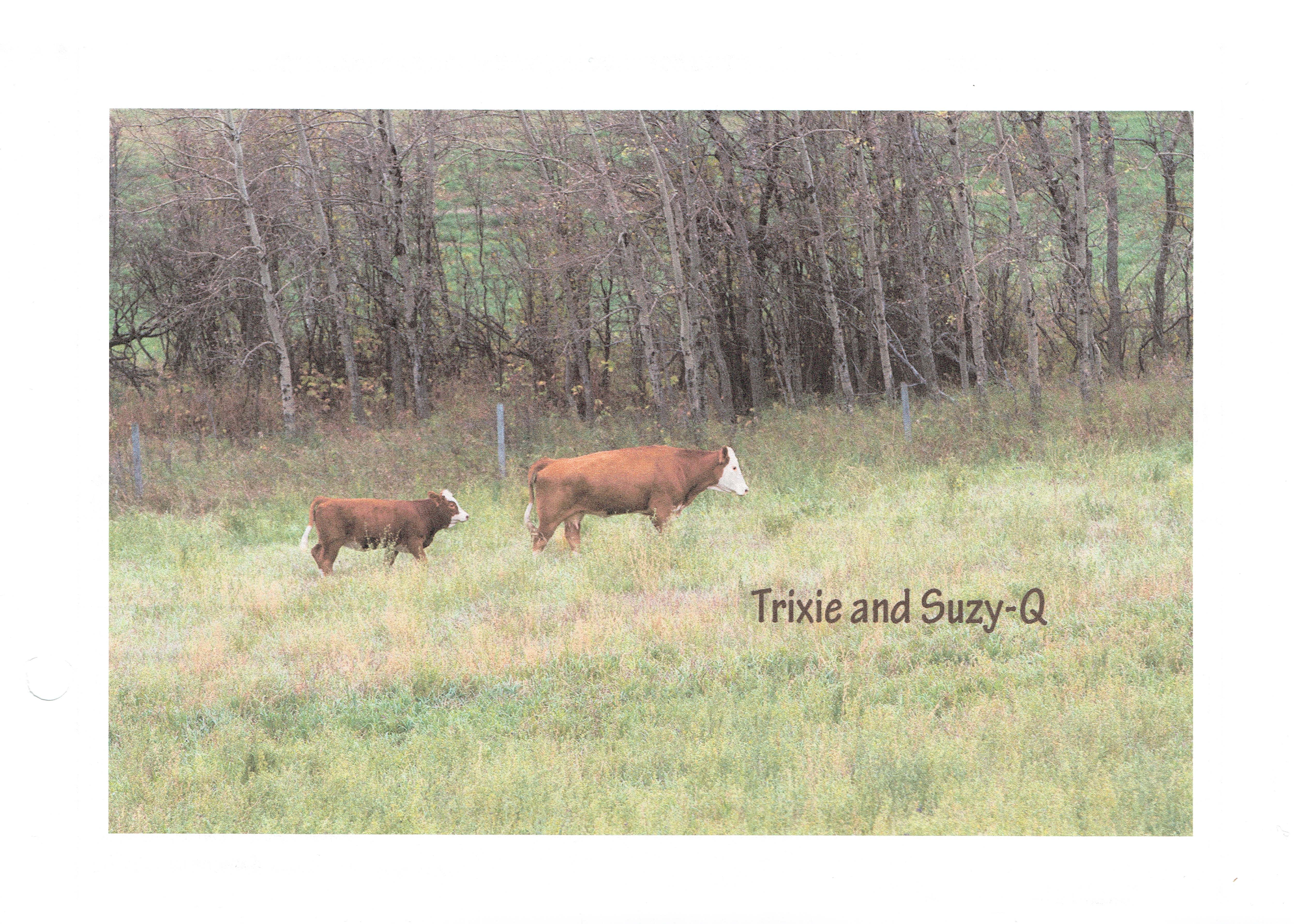 Although I’ve “been told”, over the years on the ranch, to not name my cows, I do so anyway. But only for the ones that have a unique-ness or a story or……a place in my heart. Like Trixie. She was born with a stunted back leg, thus leaving her with three good legs. I turned “tri” into “Trixie”. Because of her minor disability….she did get around fairly well….she was allowed to stay home instead of out to pasture every season. Her first calf was a handsome steer and she delivered him quite easily and on her own. In fact we were both alone that year as hubby was full-time trucking and I was nervously responsible for supervising her first calf. Then last year she needed an expensive C-Section to deliver her fancy heifer calf, Suzy-Q.